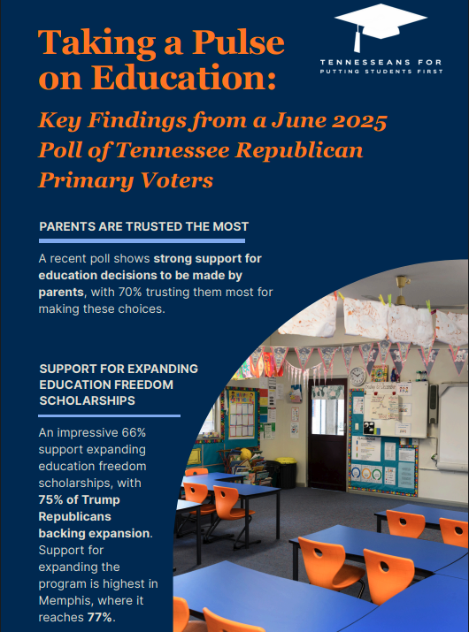 “Republican primary voters across our state are looking for bold action to improve education—not just more spending, but smarter, stronger investments and policies that are grounded in academics and based on student need,” said Chelsea Crawford, Executive Director of Tennesseans for Putting Students First. “These numbers show a clear mandate for expanding school choice, improving transparency and performance in schools, and providing resources that ensure every child is on a path to proficiency.”